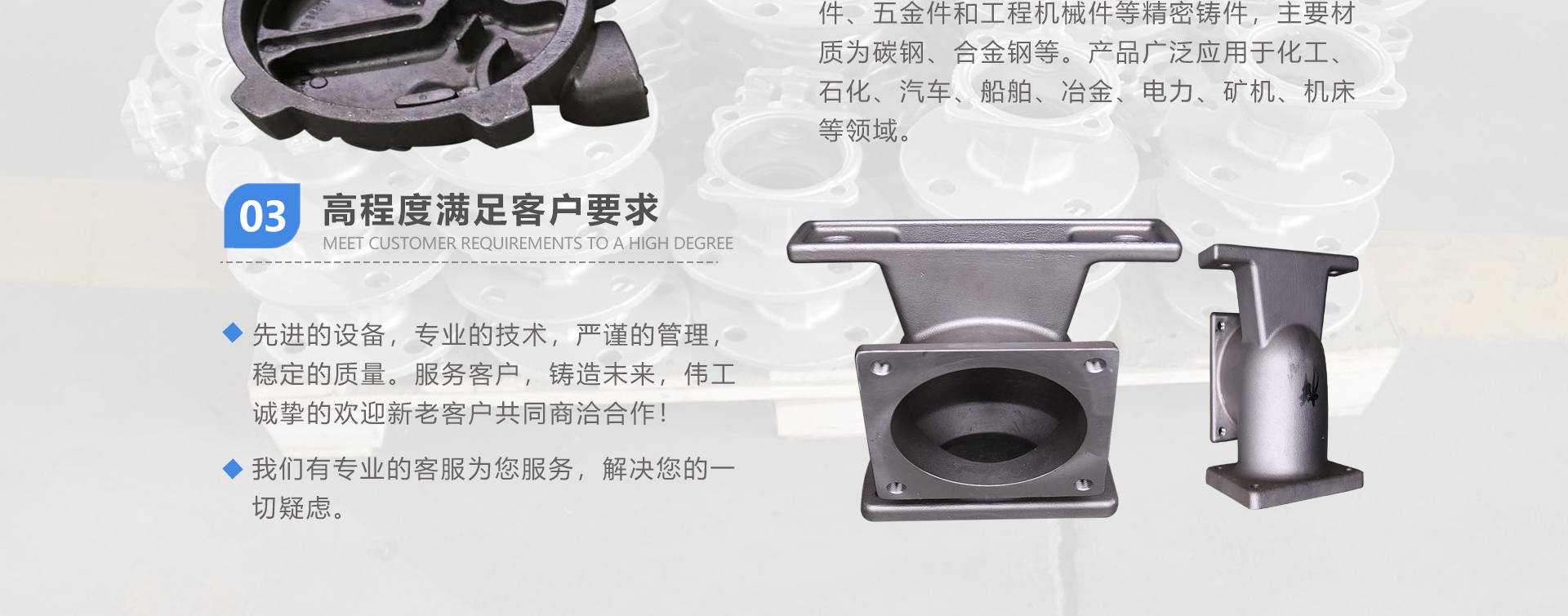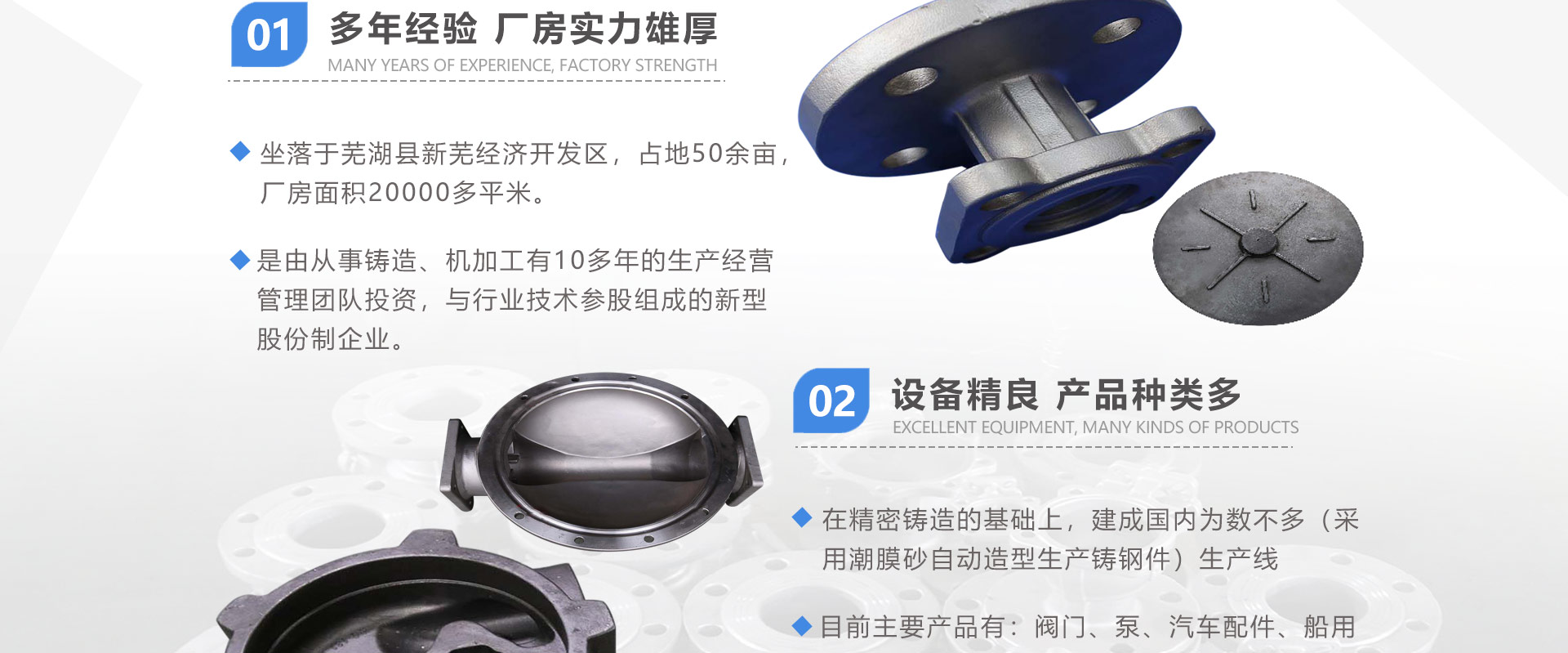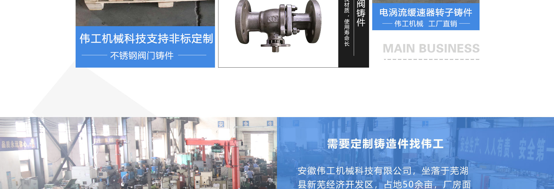 安徽偉工機(jī)械科技有限公司,坐落于安徽蕪湖新蕪經(jīng)濟(jì)開(kāi)發(fā)區(qū),是一家専業(yè)從事鑄造產(chǎn)品設(shè)計(jì)、研發(fā)、生產(chǎn)、銷售于一體的企業(yè),公司為客戶的產(chǎn)品提供多樣的技術(shù)支持與設(shè)計(jì),公司主要鑄造技術(shù)有潮模砂鑄造、硅溶膠精鑄工藝。主要產(chǎn)品有:不銹鋼閥門配件、泵閥配件、汽車配件、工業(yè)管道配件、工程機(jī)械配件、汽車配件等。材質(zhì)為:低合金鋼、304、316、316L、鉻鉬鋼、哈氏合金、碳鋼、雙相鋼等。公司已先后通過(guò)ISO9001和TS16949等多種體系審核,以完備的管理手段和齊全的檢測(cè)設(shè)備滿足客戶需求,進(jìn)的設(shè)備,専業(yè)的技術(shù),嚴(yán)謹(jǐn)?shù)墓芾恚€(wěn)定的質(zhì)量。服務(wù)客戶,鑄造未來(lái),偉工誠(chéng)摯的歡迎新老客戶共同商洽合作